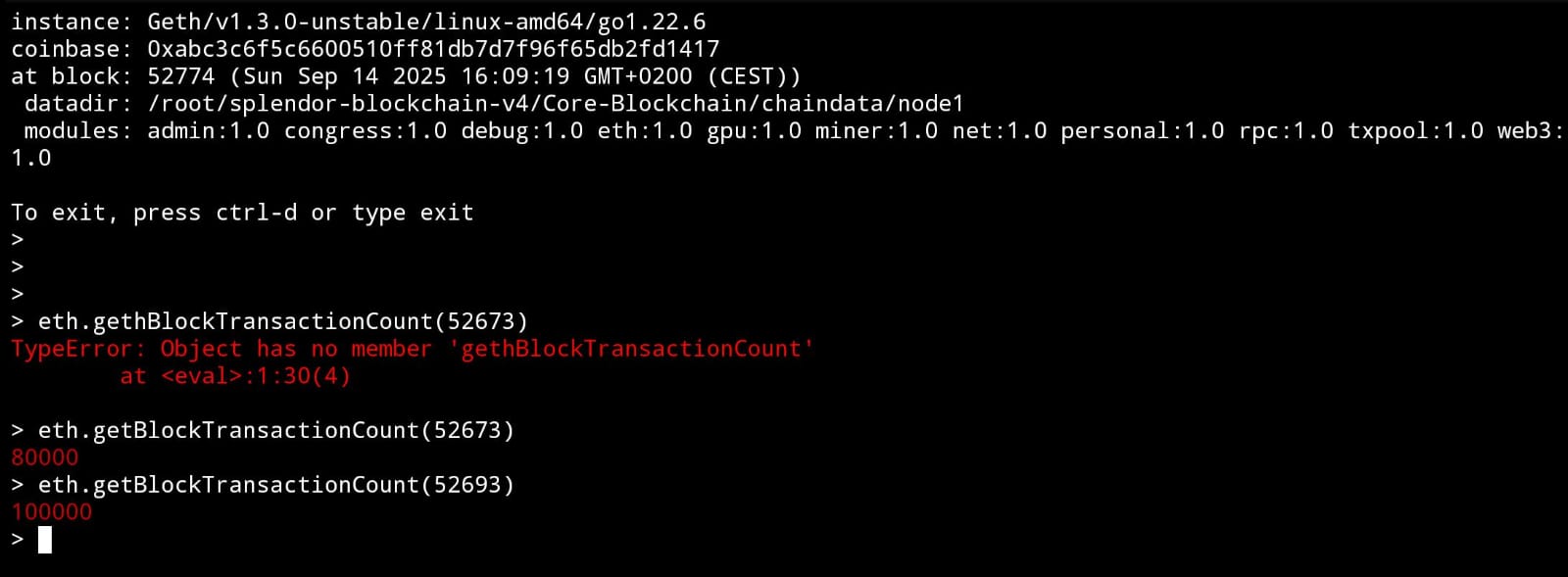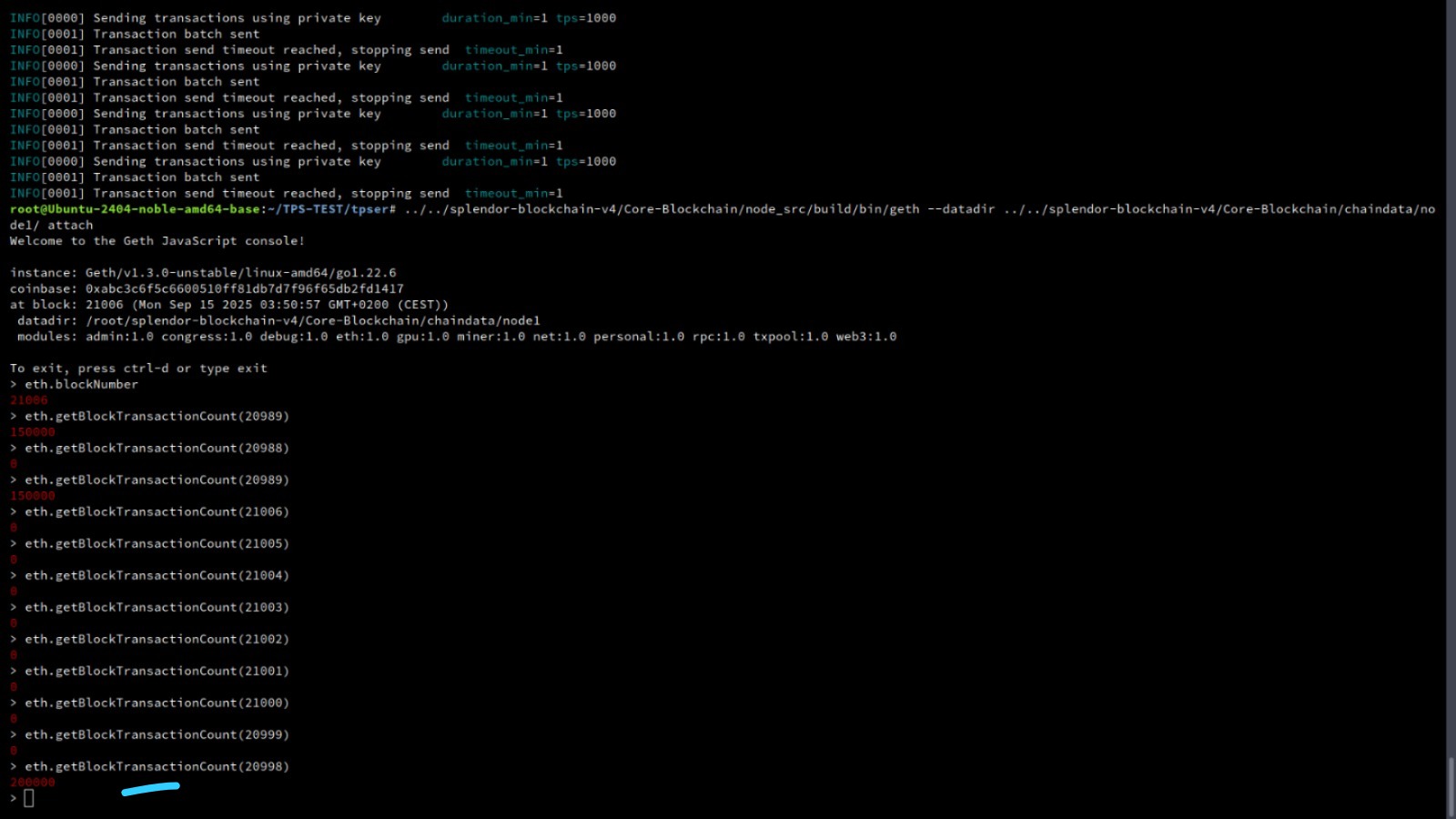The following screenshots demonstrate actual TPS measurements from our live Splendor blockchain network, showing consistent high-throughput performance across multiple test scenarios.