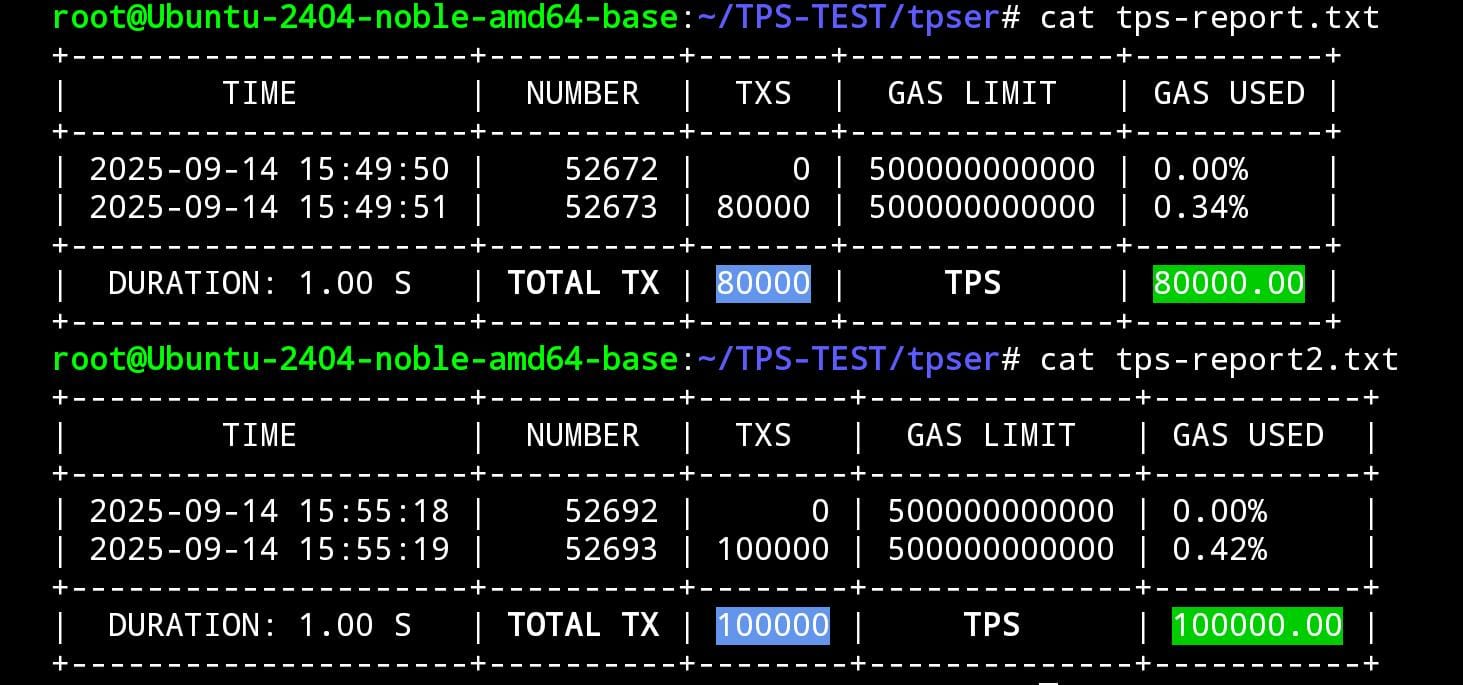 | 100,000 TPS Benchmark | 2025-09-15 01:11:26 UTC | 20980 | 100,000 | 100,000.00 | 0.42% | Verified |